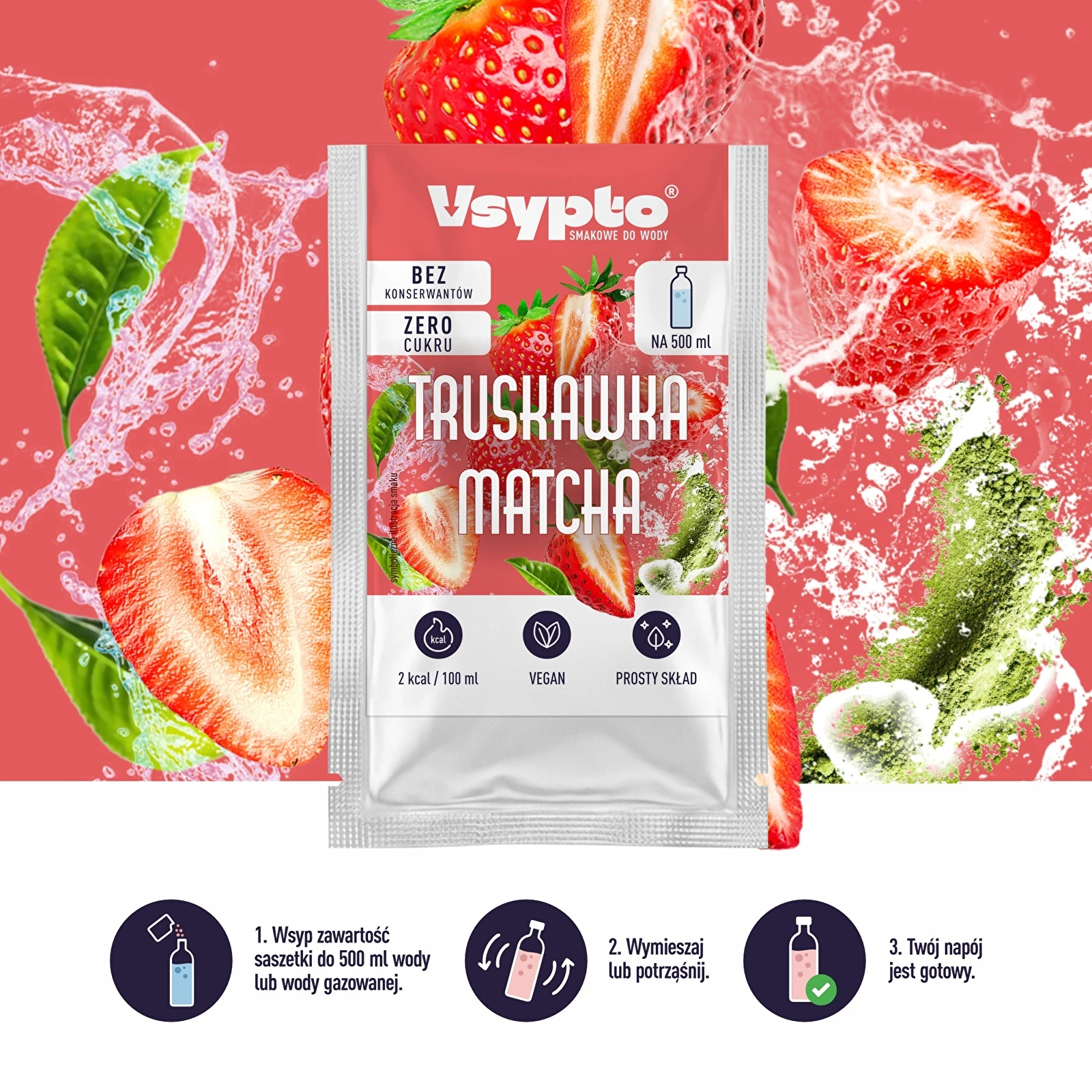 Czas na Vsypto! Wybierz swój smak i po prostu wsyp to do wody! Ciesz się pysznym napojem o wyrazistym smaku i apetycznym kolorze, bez dodatku cukru!